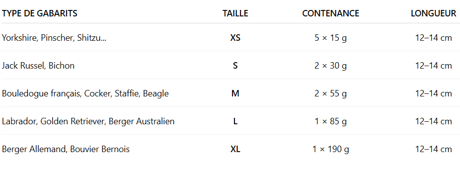 Pour chiens de tous gabarits au-delà de six mois. Pour les chiots, optez pour les dés de fromage à souffler ou passer le bâtonnet directement au micro ondes pour faciliter la mastication.